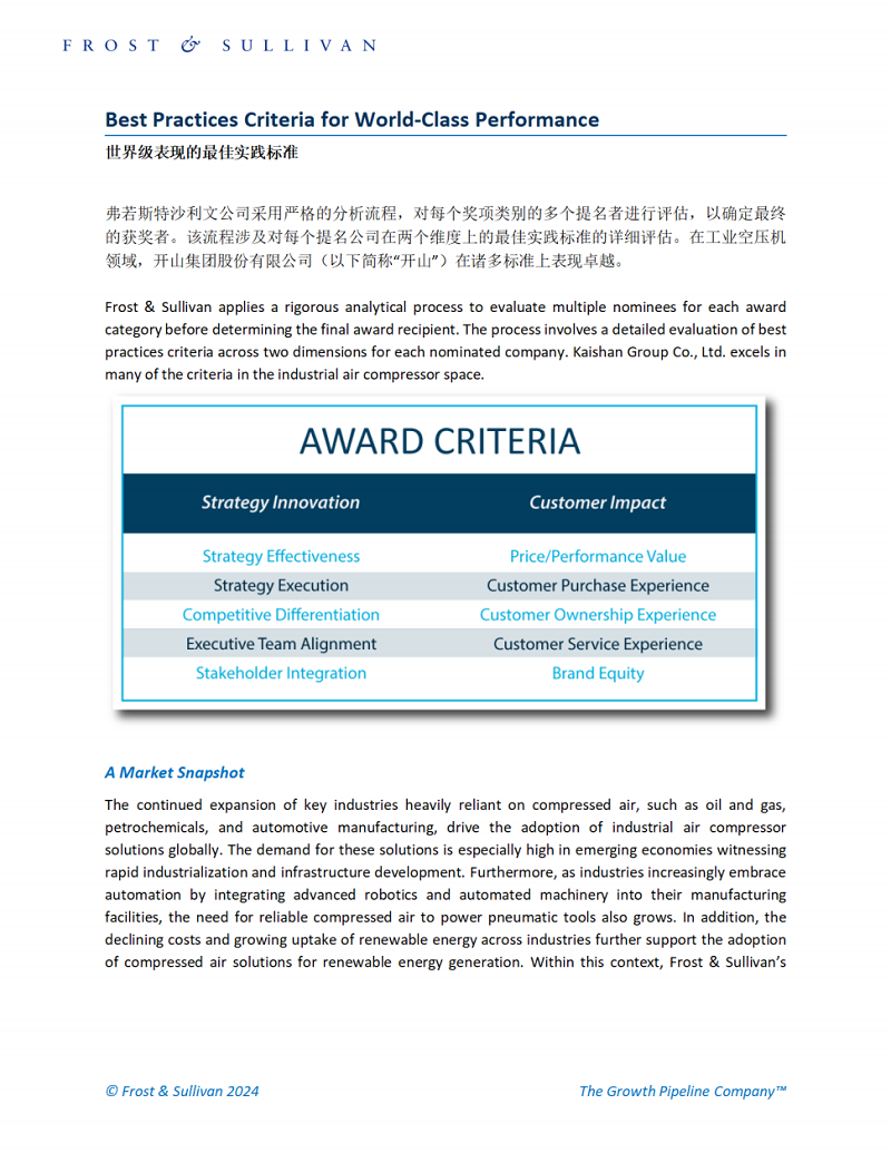 Frost & Sullivan對開山獲得“全球工業(yè)壓縮機競爭戰(zhàn)略領(lǐng)導(dǎo)獎”的頒獎詞