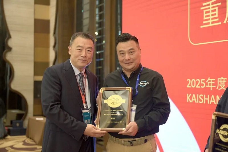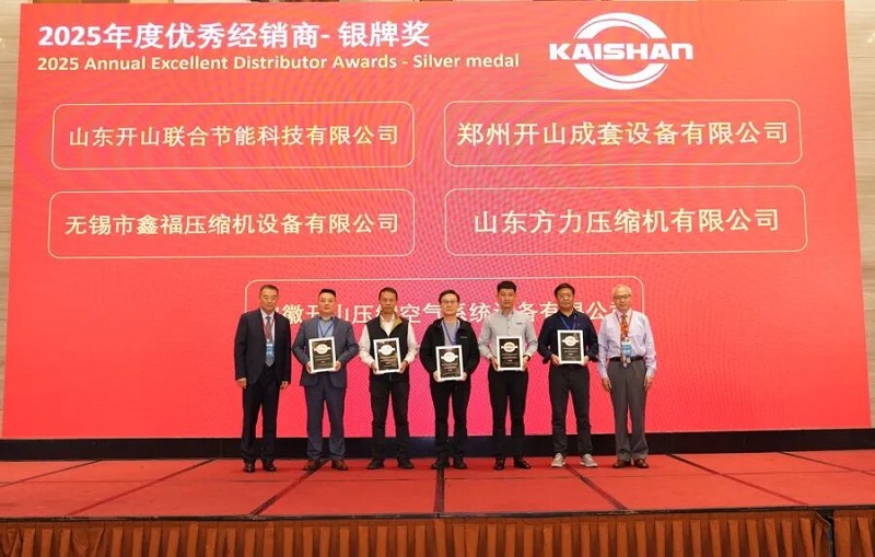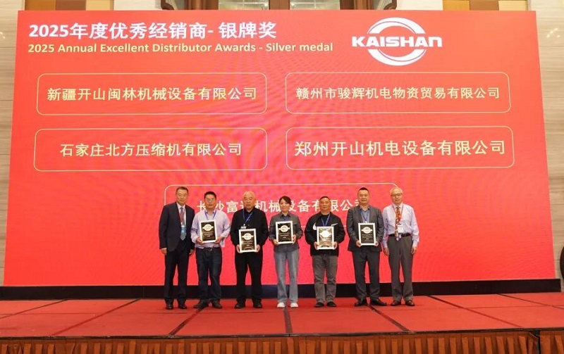 本屆大會(huì)按慣例,為34家優(yōu)秀經(jīng)銷單位頒發(fā)了獎(jiǎng)牌。與以往不同的是,其中十家經(jīng)銷單位因?yàn)檫B續(xù)五年獲評(píng)“最佳經(jīng)銷單位”,獲頒特制銀質(zhì)獎(jiǎng)?wù)隆R瞬┝﹂_山機(jī)電設(shè)備有限公司和重慶開山一機(jī)節(jié)能設(shè)備有限公司因?yàn)?025年度銷售/訂單突破億元,首次獲頒金質(zhì)獎(jiǎng)?wù)隆F渲幸瞬┝σ堰B續(xù)三年銷售過億元,主要銷售開山重工的全液壓鉆車機(jī)系列高端產(chǎn)品。重慶開山一機(jī)則銷售包括干式無油螺桿空壓機(jī)、大功率螺桿空壓機(jī)、變節(jié)距干式真空泵、離心式壓縮機(jī)等高端產(chǎn)品。公司祝賀并感謝這兩家公司在幫助開山拓展高端市場取得的突出成就。曹董號(hào)召全體經(jīng)銷單位以他們?yōu)榘駱?,冀望有更多的銷售超億元經(jīng)銷單位涌現(xiàn)。