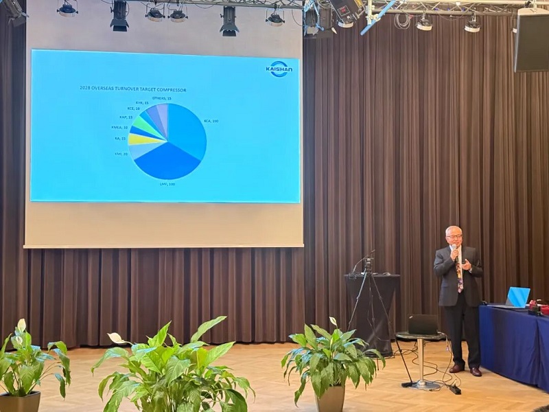 曹克堅董事長在開場講話中向與會者介紹了開山在2025年取得的各項成就,特別是開工建設肯尼亞綠氨項目這一里程碑事件,著重講解了開山戰(zhàn)略,并將未來三年的戰(zhàn)略任務細化分解給各個公司。他對LMF(奧地利)、KCA(北美)、KMI(印度)、KA(澳大利亞)等業(yè)績出色的公司給予了表揚,對于2025年新創(chuàng)立公司,以及個別經(jīng)營業(yè)績不佳、更換了經(jīng)營團隊的公司給予了鼓勵。曹董強調(diào),海外團隊肩負著幫助開山成長為跨國公司的重要使命,要通過扎實經(jīng)營和持續(xù)努力,確保營業(yè)收入與利潤的穩(wěn)定持續(xù)增長,實現(xiàn)開山品牌成為全球壓縮機主要品牌這一戰(zhàn)略目標。